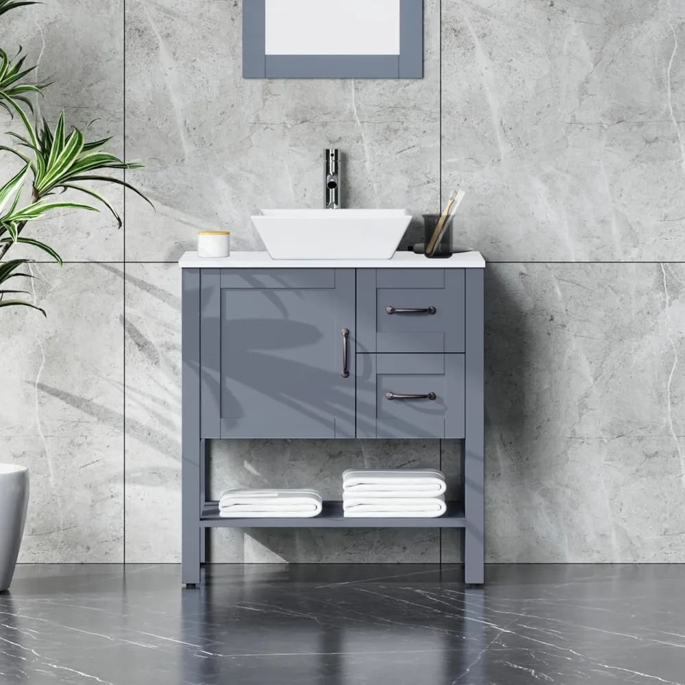 30" Gray Bathroom Vanity Sink Combo Modern Single Vessel Sink Bathroom Cabinet with 2 Drawer, Chrome Faucet, Drain, Mirror, Free