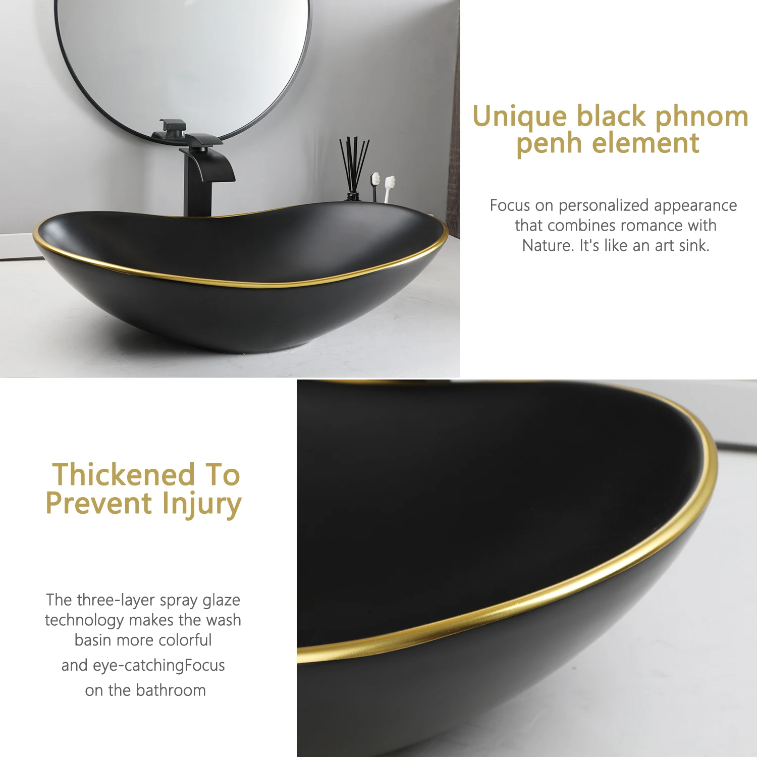 KEMAIDI Black Bathroom Sink with Gold Trim Oval Porcelain Vessel Sink with Faucet Drain Combo Above Counter Wash Basin Sink Bowl